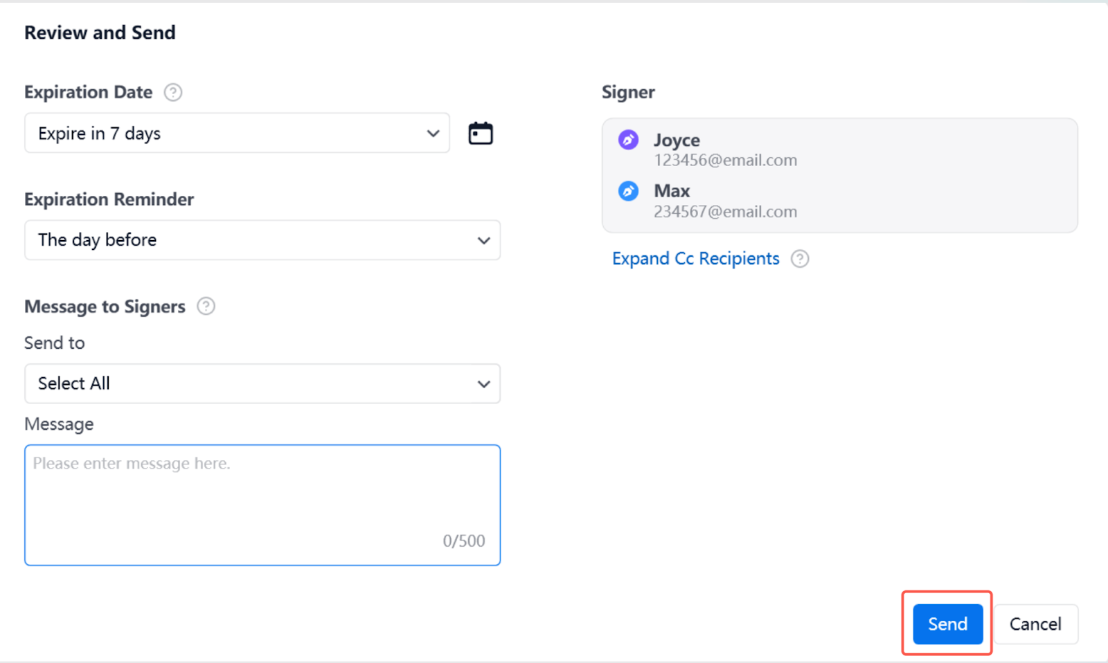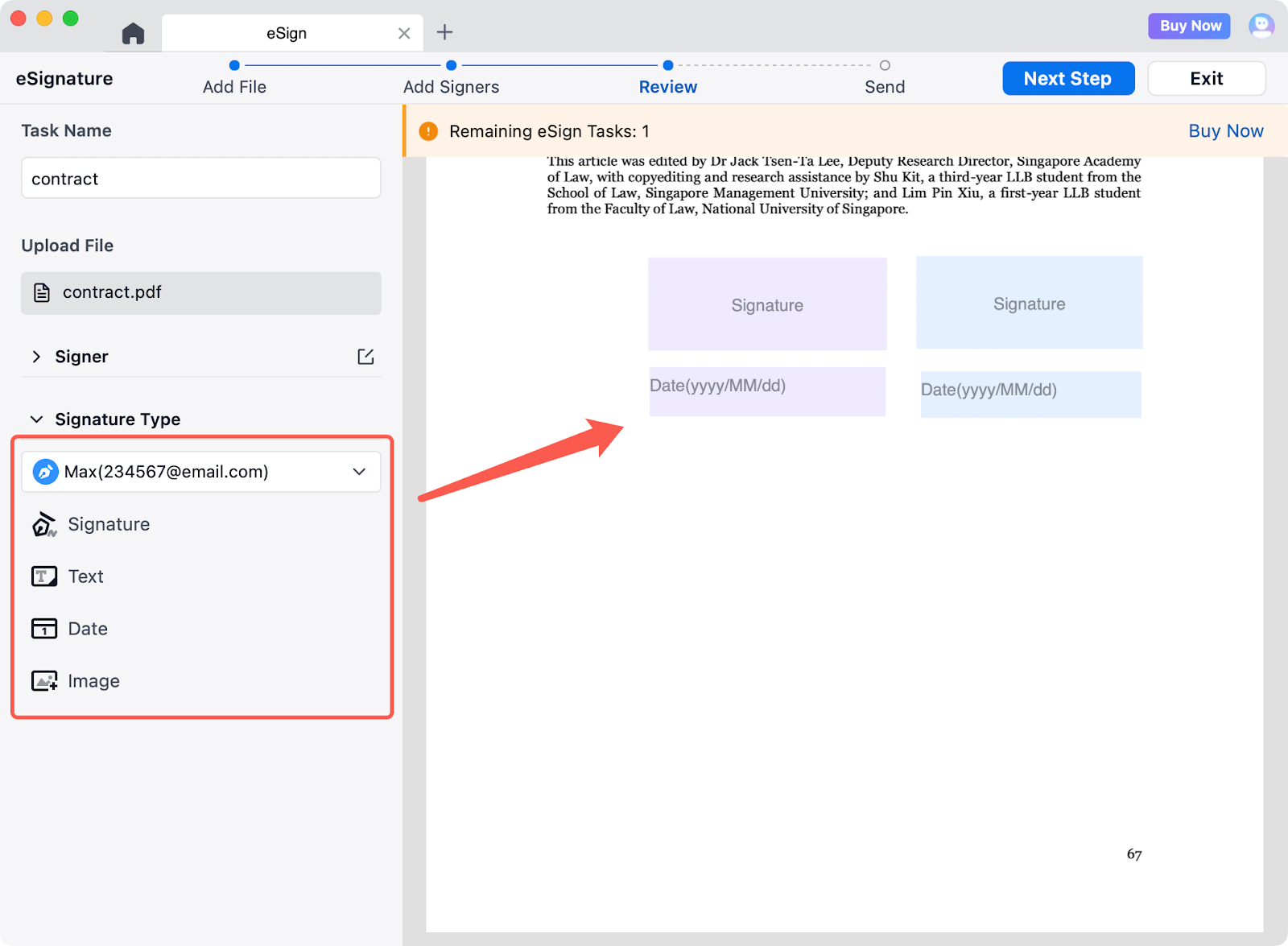 4. Review and Place Fields: Select Signature, Text, Date, or Image from the left panel and click on the document to place these fields. Make sure to assign specific fields to each individual signer. Click Next Step, and in the pop-up window, you can set expiration dates and reminders. Click OK to send the request.
