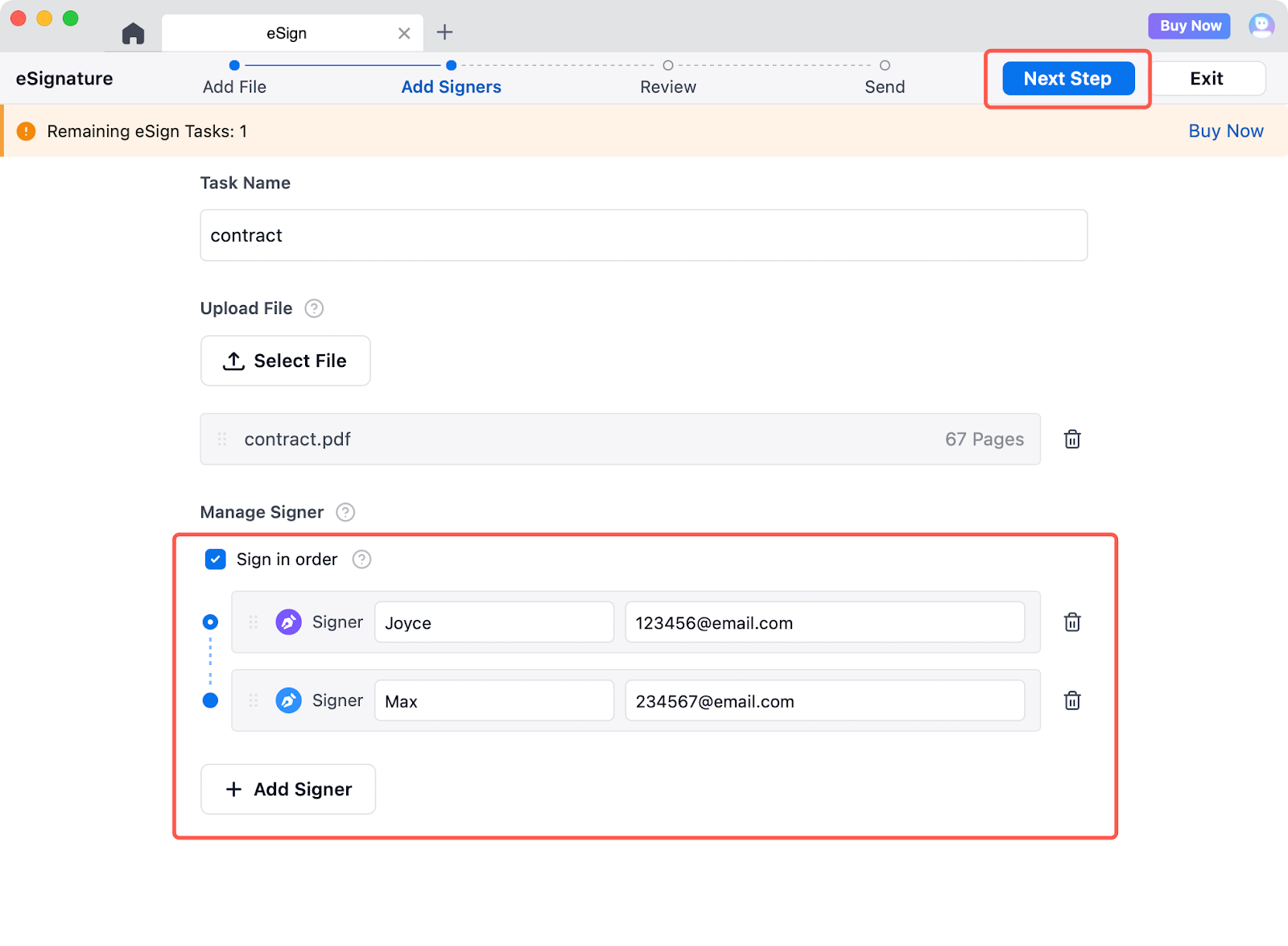 3. Add Signers: Enter a name for your task and add the names and email addresses of your recipients (up to 10 signers). To ensure people sign in a specific sequence, check the Sign in Order box. Click Next Step to proceed.