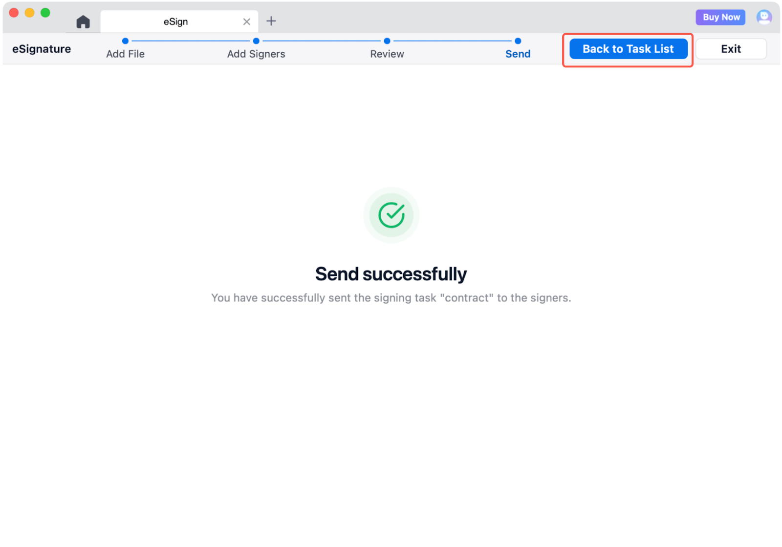 5. Track Progress: Once you see the "Sent Successfully" message, click Back to Track List to monitor the real-time status and progress of your signing task.