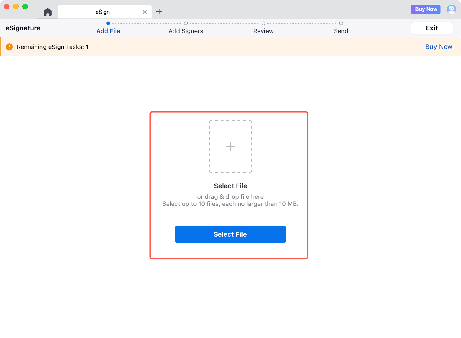 2. Add Files: Click Select File to upload the documents you need signed. You can upload a maximum of 10 files at once, with a size limit of 10MB per file.